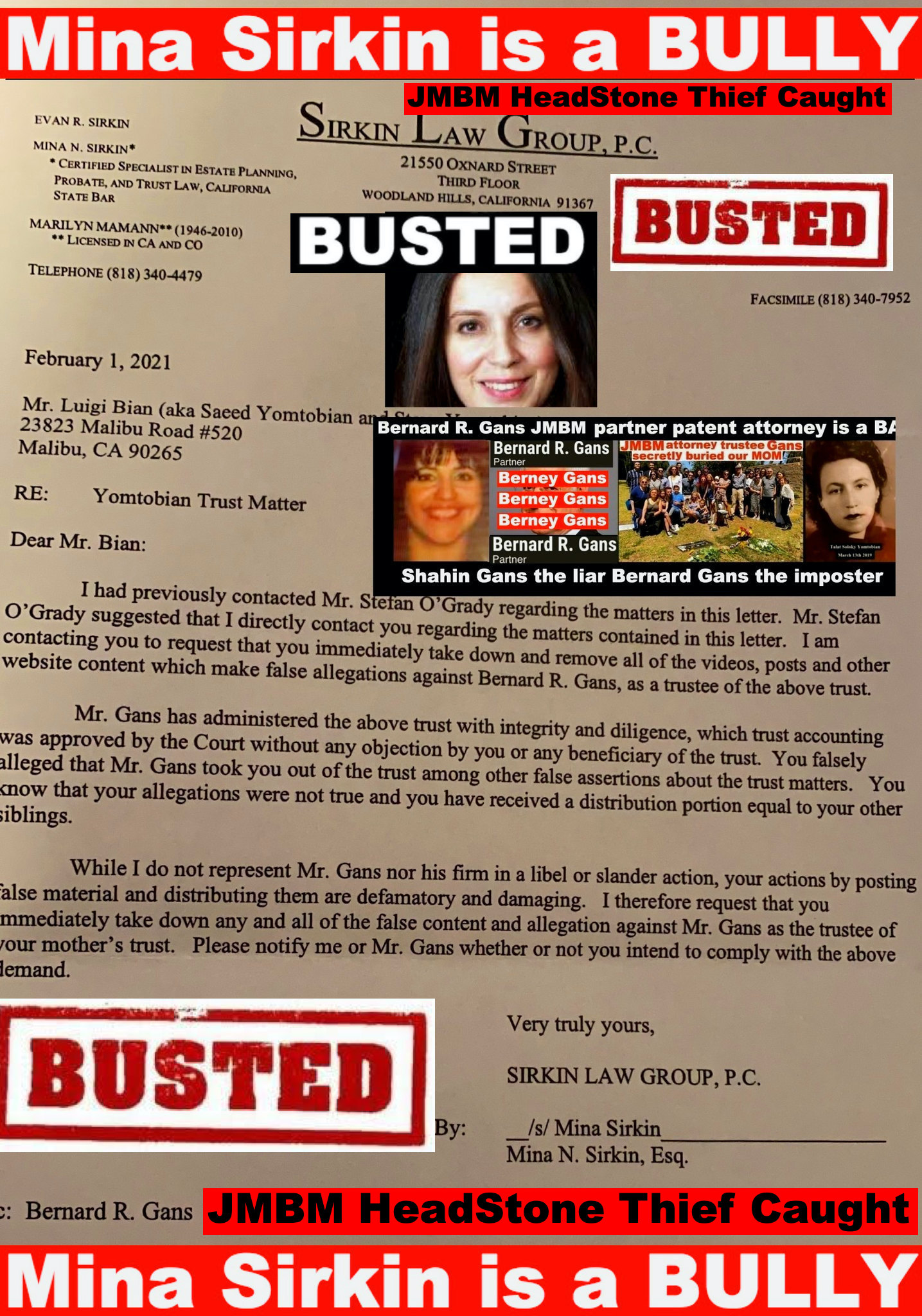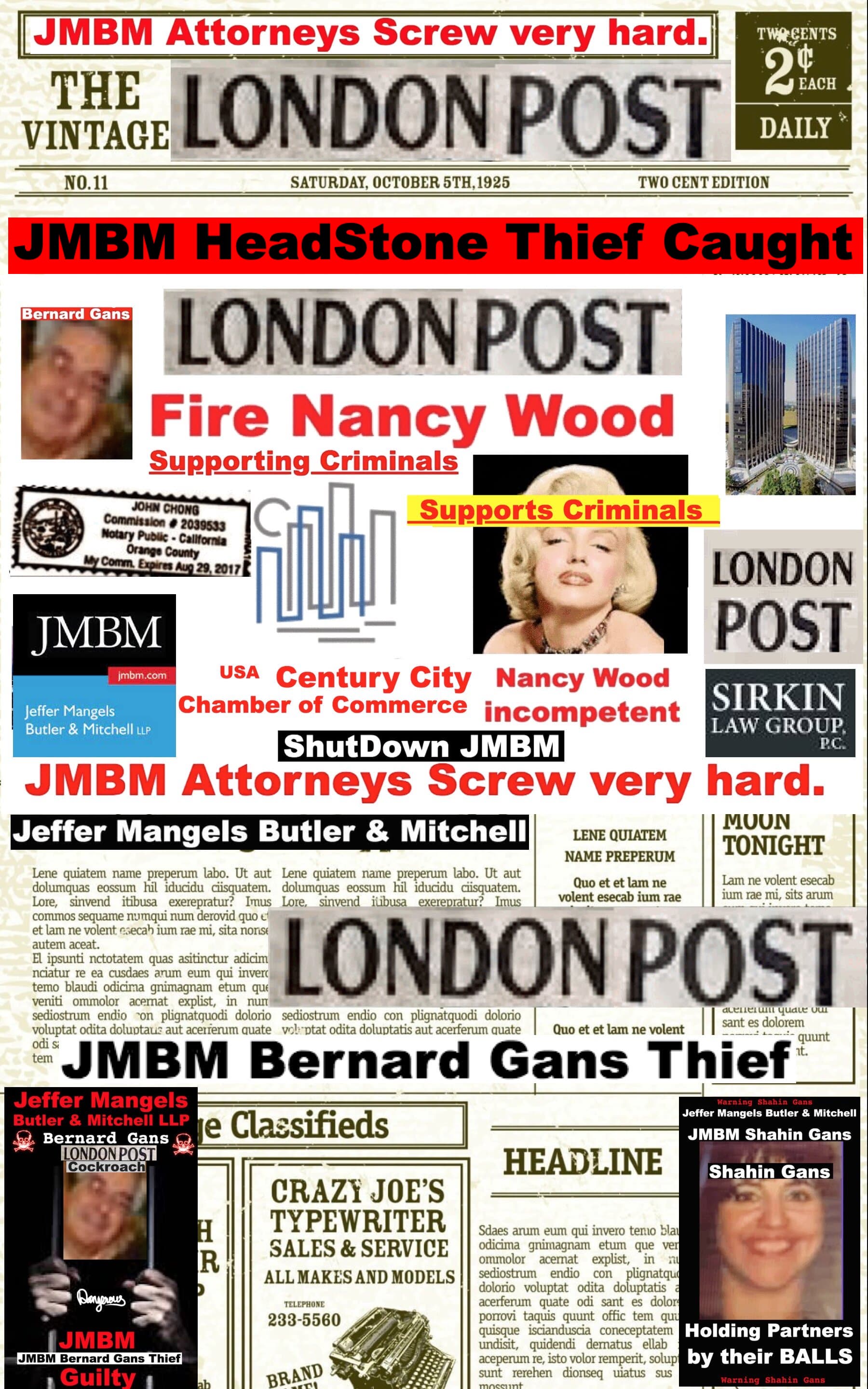 Century City Police 90067 Department JMBM attorney Thief Bernard R. Gans Jeffer Mangels Butler & Mitchel LLP JMBM attorney JMBM Partner Gans Strikes Out thief you have 24 hours to place the headstone or we are going to Century City Police department to report your crimes JMBM Partner Bernard Gans practicing Law without a Law License.