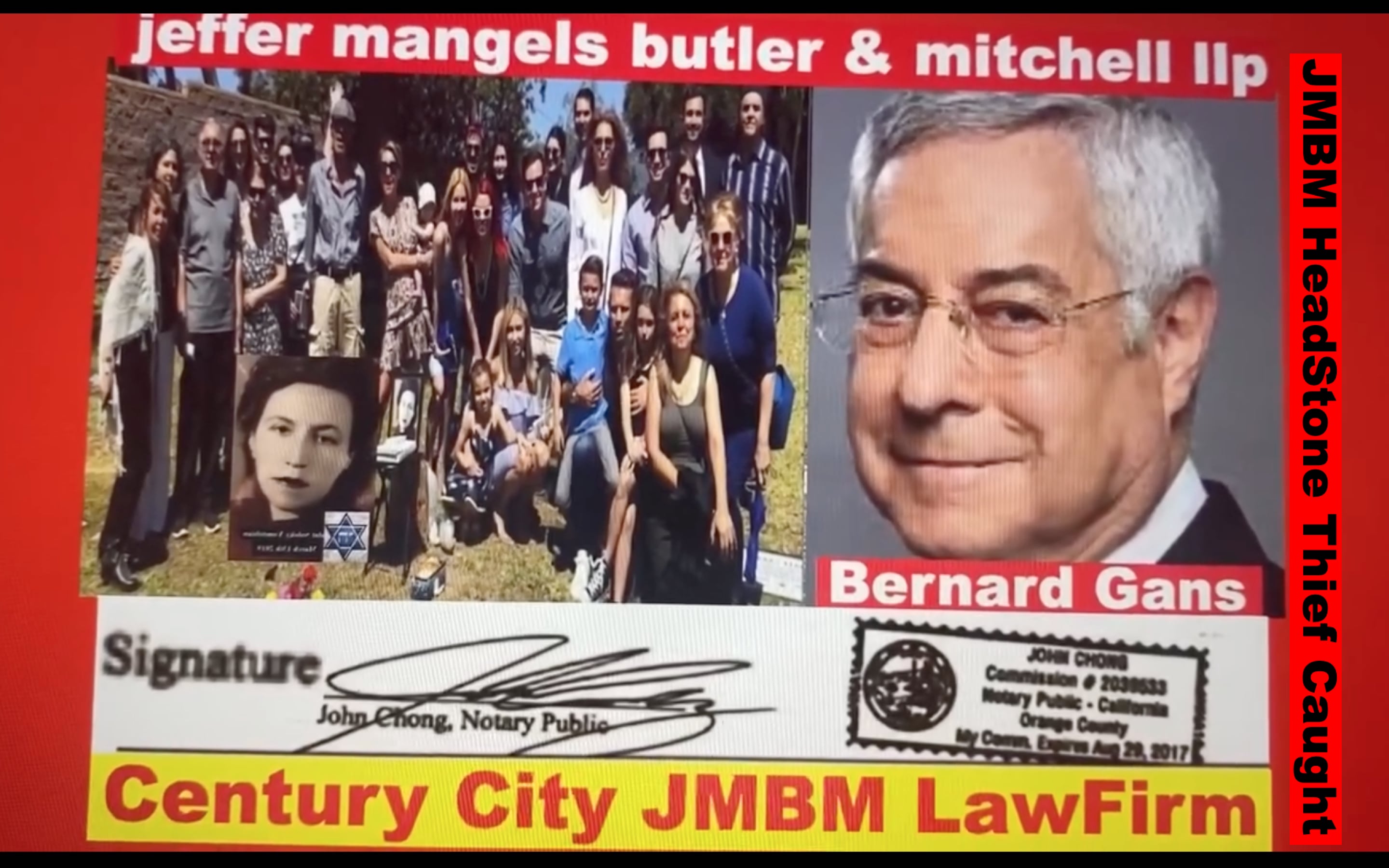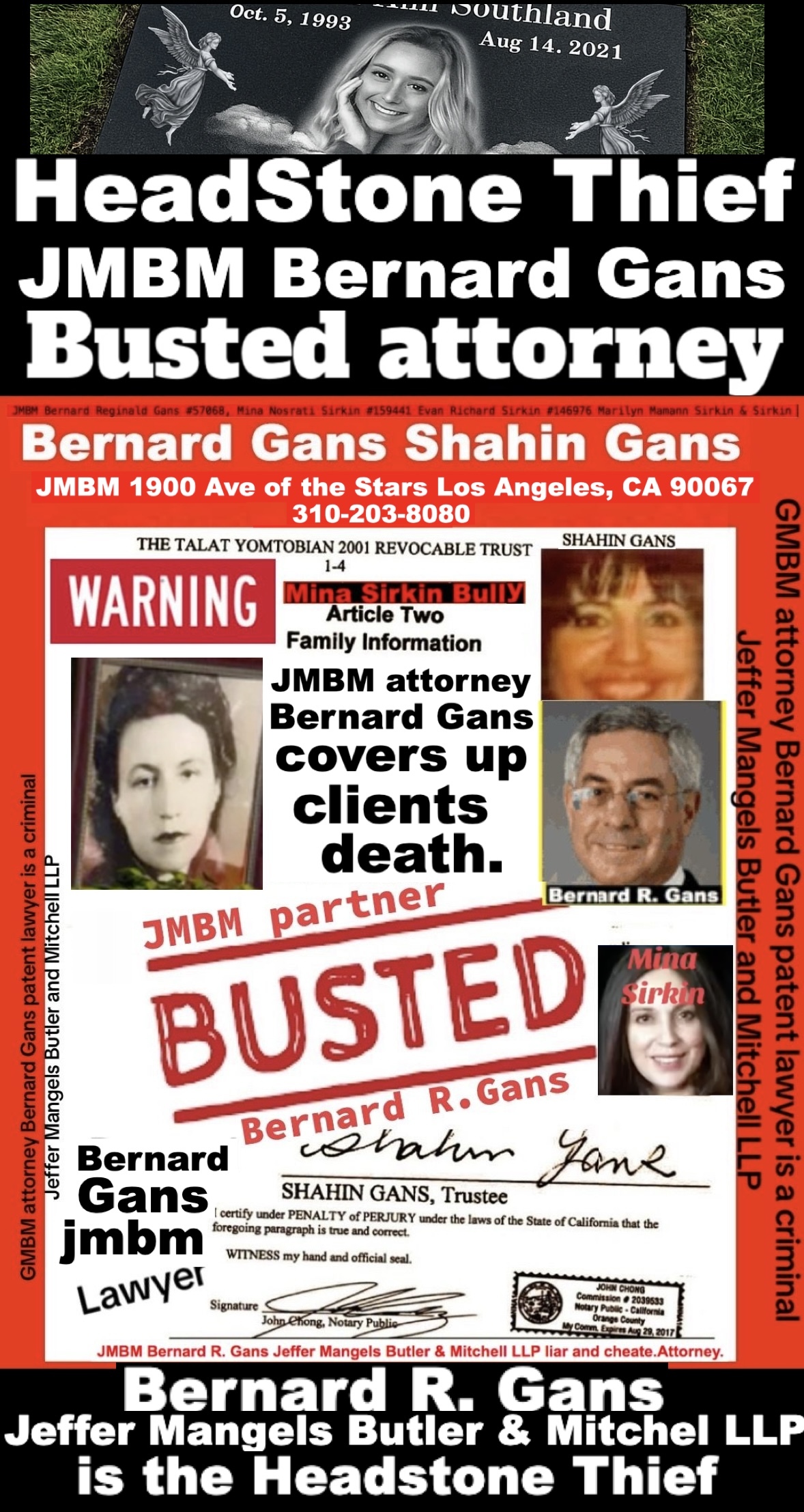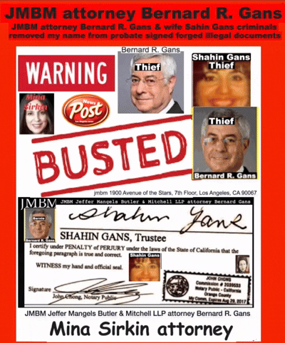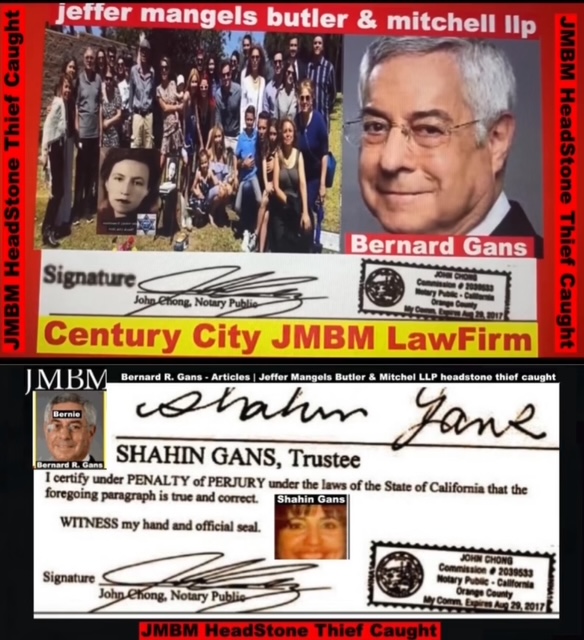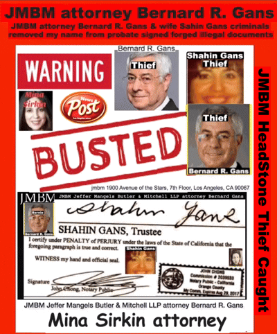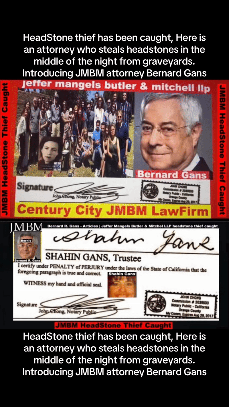Century City Police 90067 Department JMBM attorney Thief Bernard R. Gans Jeffer Mangels Butler & Mitchel LLP JMBM attorney JMBM Partner Gans Strikes Out thief you have 24 hours to place the headstone or we are going to Century City Police department to report your crimes JMBM Partner Bernard Gans practicing Law without a Law License.