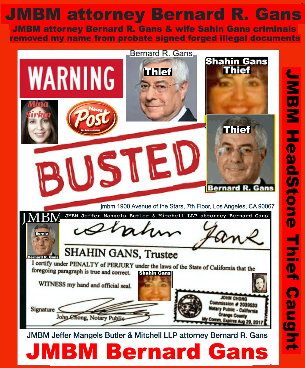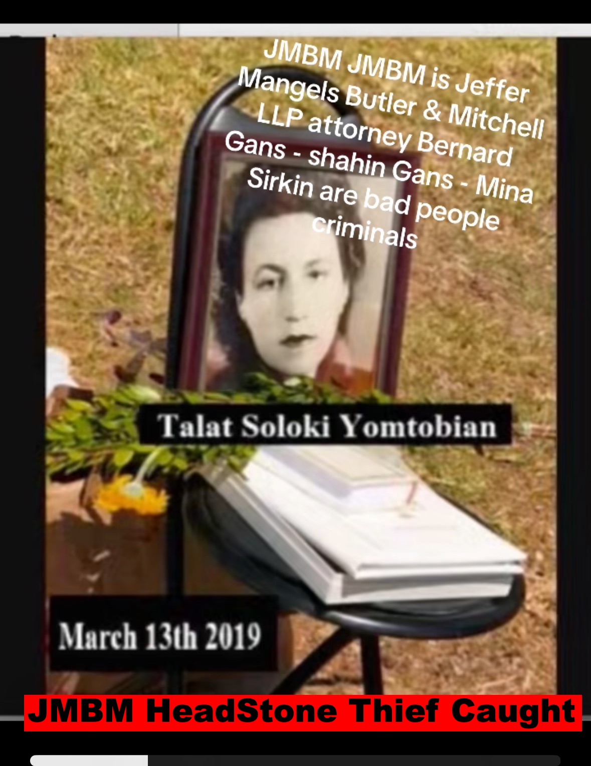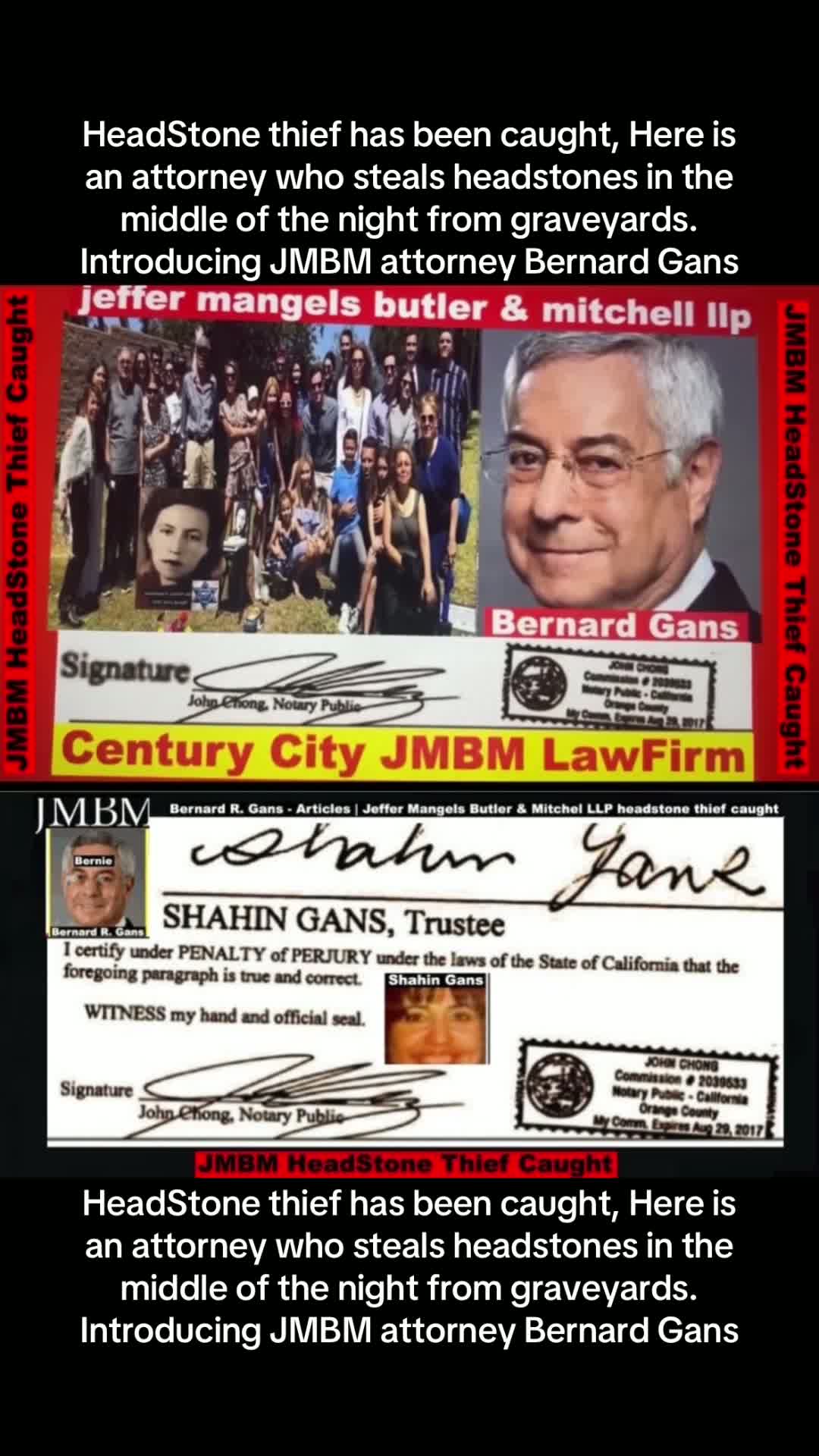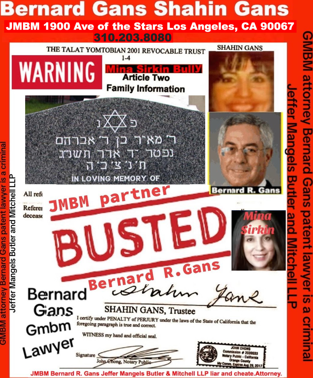 Century City Police 90067 Department JMBM attorney Thief Bernard R. Gans Jeffer Mangels Butler & Mitchel LLP JMBM attorney JMBM Partner Gans Strikes Out thief you have 24 hours to place the headstone or we are going to Century City Police department to report your crimes JMBM Partner Bernard Gans practicing Law without a Law License.